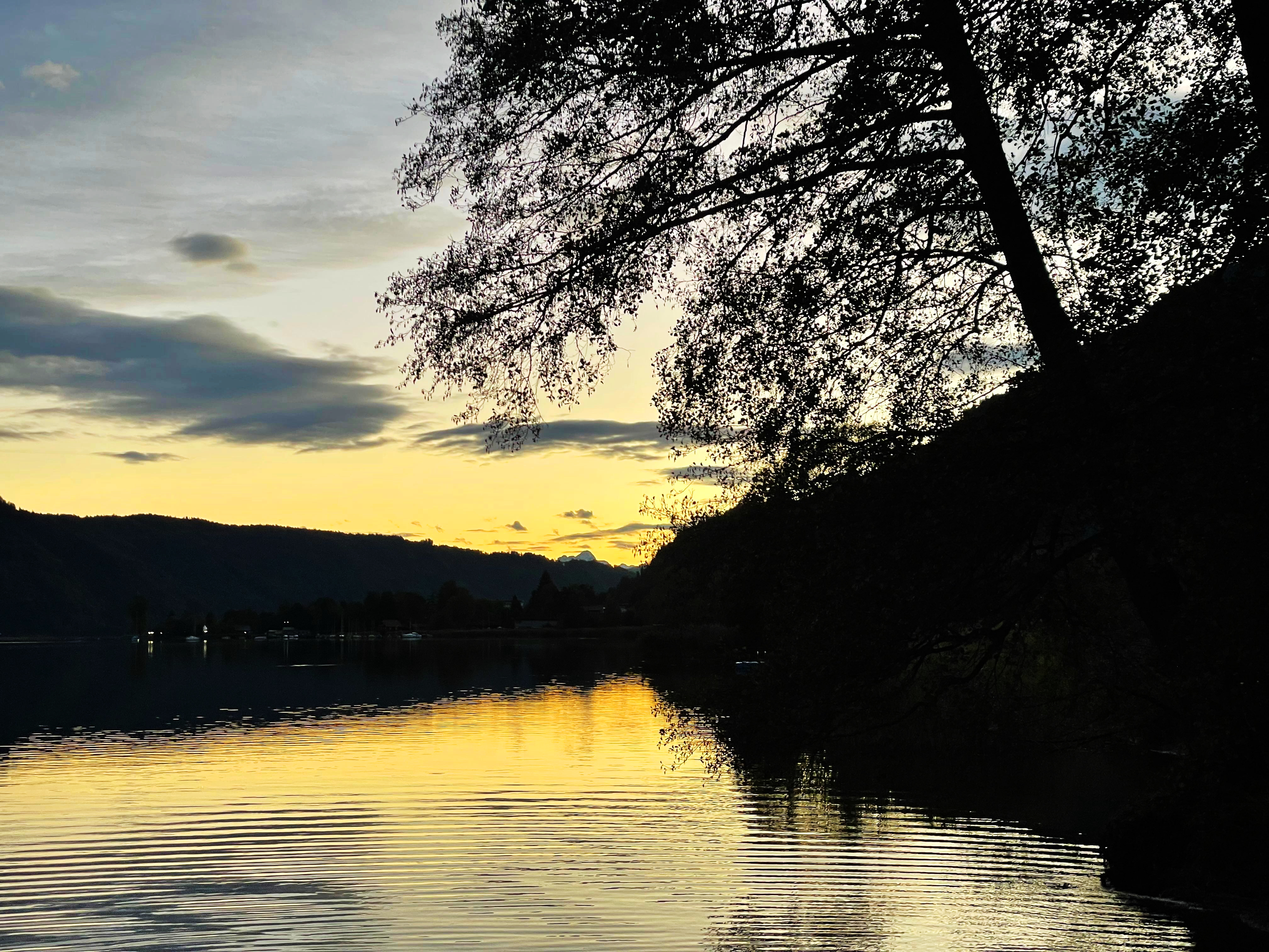 den Kaffee am glitzernden Wasser, die erfrischende Abkühlung nach dem Sonnenbad, das Leuchten der Abendsonne über der stillen Wasserfläche.